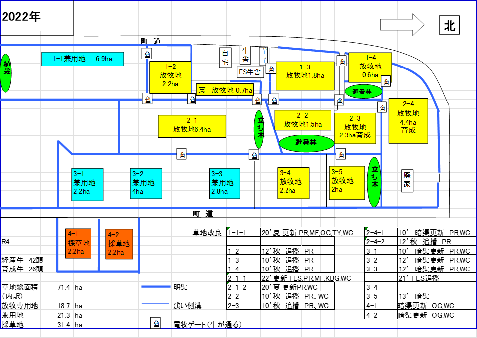 兼用地は1番草収穫後の7月以降と2番草収穫後の9月以降に放牧利用します。