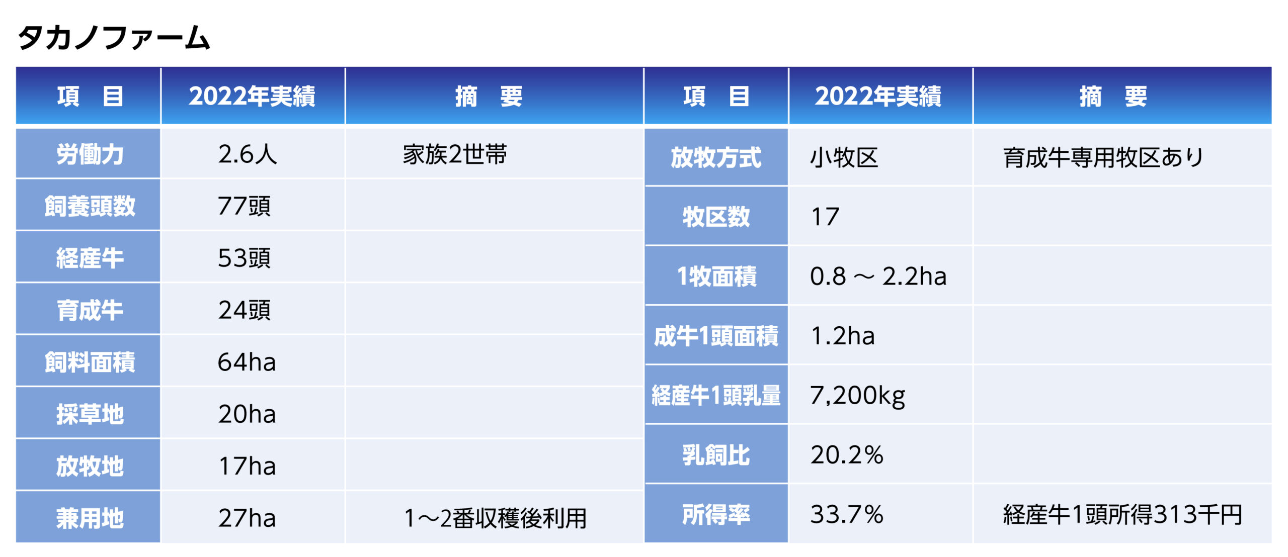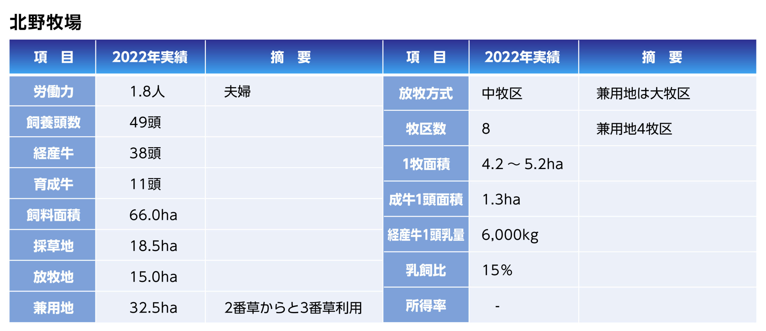 家族経営であり2世帯で運営しています。放牧地は平坦地と丘陵地にあり、小牧区と中牧区の組み合わせ利用です。兼用地は1番収穫後からの利用(7月以降)と2番草収穫後(9月以降)利用でいずれも大牧区利用です。また育成牛専用放牧地は丘陵地にあります。植生状態によって小牧区と中牧区を柔軟に活用して効率利用に努めています。兼用地は夏から秋にかけて放牧草の衰退期に大牧区として利用します。昼夜放牧です。