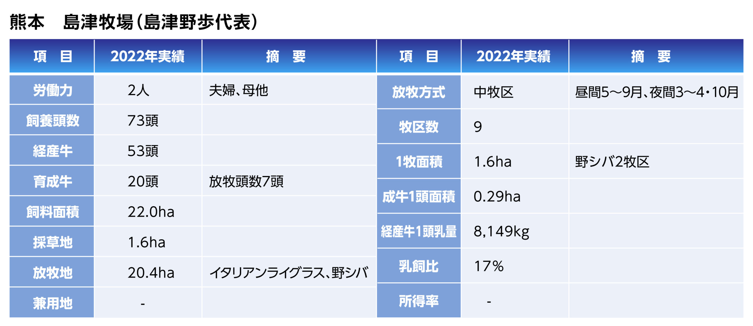 地域は暖地でもあり、周年放牧利用が可能です。このためほとんどの草地を放牧利用としています。また低地の稲作経営から飼料稲栽培も受託しWCS調製して補完することで飼料自給率を高めています。