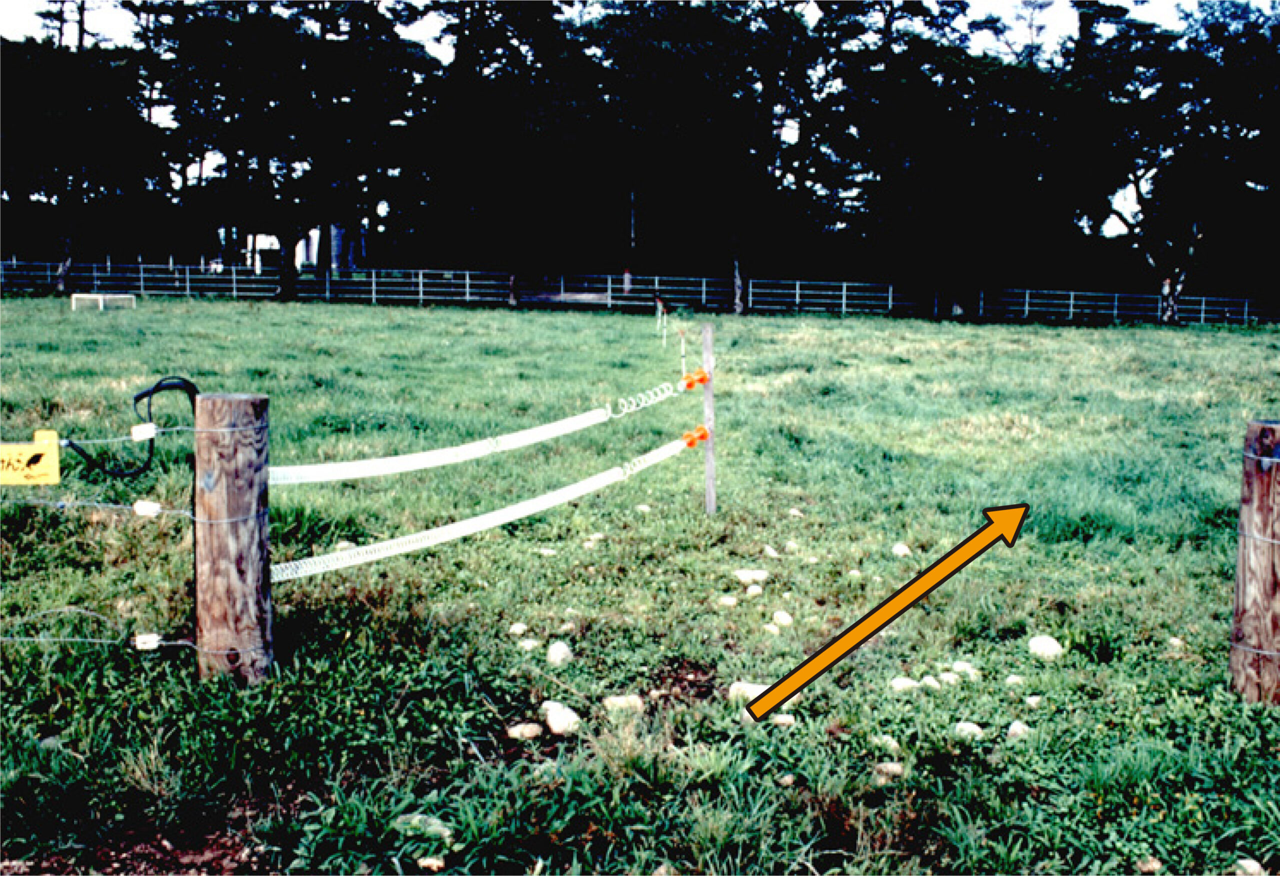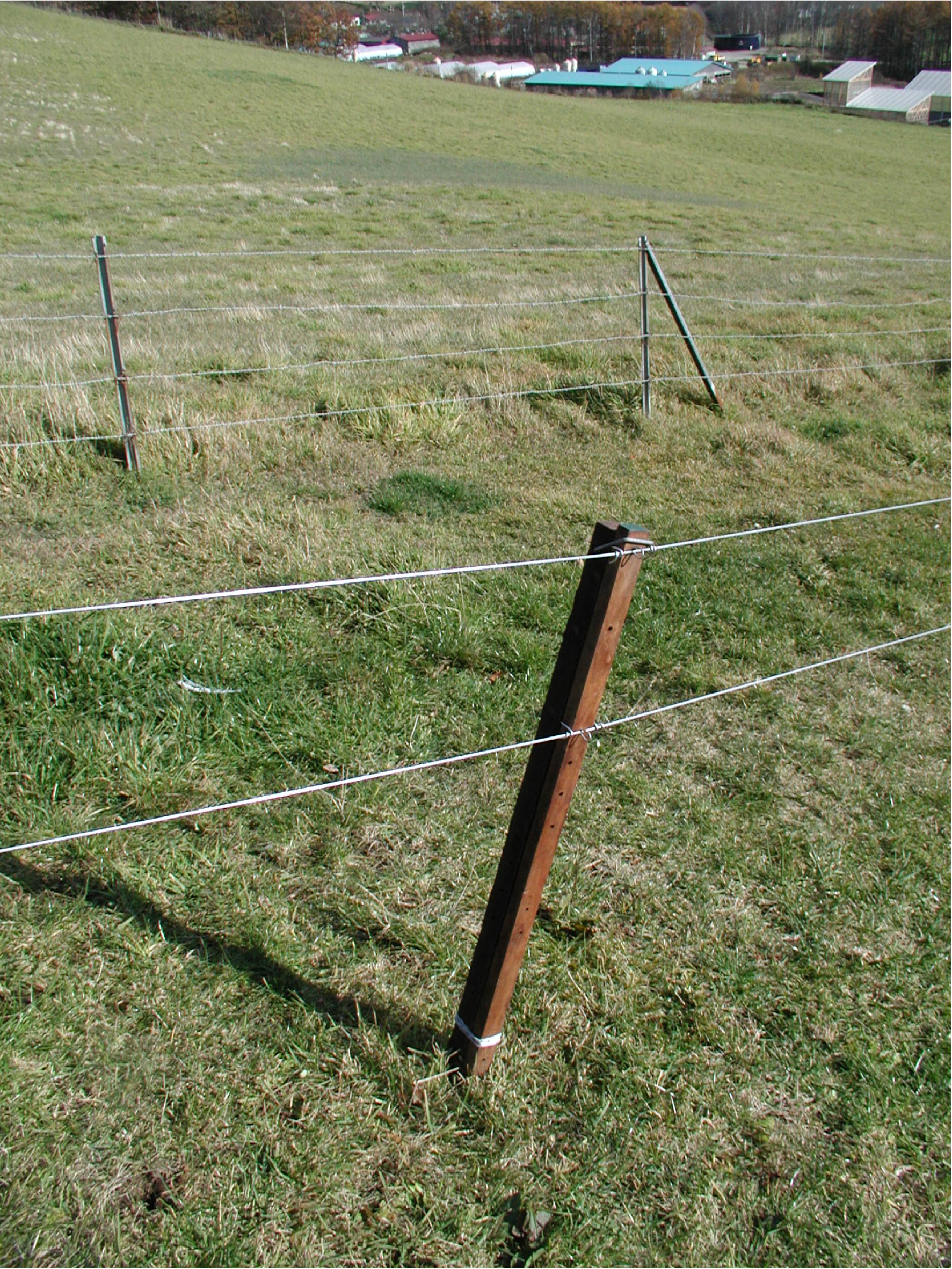 外柵は脱柵、野生動物の侵入を防ぐために十分な強度が必要です。張力を緩めて倒伏させることができるタイプの高張力線は、降雪時や作業機を入れるときに便利です。簡易な電気柵は物理的な強度はなく、電気ショックを嫌う心理柵です。事前に牛に電気柵に慣れさせてから放牧します。また、通電していないことがわかると、簡単に脱柵するので、漏電がないように日頃から確認します。スプリングゲートは長さの異なる出入り口に利用できて便利です。牧区の出入口の場所は牛の移動の労力に大きく影響します。動線をよく考えましょう。