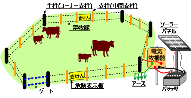 牧場の境界線には牛の脱走や野生動物侵入防止の丈夫な外柵を、放牧地内は移動が容易な簡易な電気牧柵を利用します。