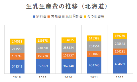農林水産省が公表(2023)している近年の酪農経営の生産費用について整理すると表のような内容になります。搾乳牛1頭当たりで示しました。北海道と都府県でその構成内容にはやや相違が見られますが、共通しているのは飼料費が最大費用であることです。次に減価償却費と労働費が続きます。この3費用が酪農経営の最大費用であり、生産費用全体を大きく左右しているといえます。