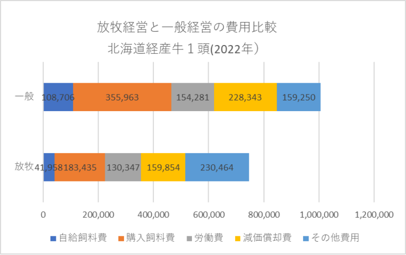 このことの実態が費用比較に示されています。従来はこれほどの費用格差ではなかったのですが2022年の購入飼料価格の高騰が購入飼料依存度の高い通年舎飼い経営の飼料費を大きく増大させて利益を急減させたと言えます。購入飼料費の依存度の低い自給飼料重視経営や放牧経営ではこの影響が少なくなり、生産費用の格差が一層広がったものです。